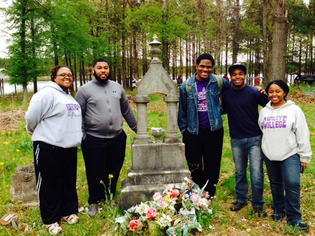 4-5-14, Wiley College students left to right: NaQuita Elmore, Marcus Shelton, Kylan Pew, Cameron Spearman, and Starsha, on either side of Ohio Taylor’s headstone. Taylor was born in 1834 and died in 1918. He is Mrs. Doris Vittatoe’s great-grandfather. Vittatoe is the President of The Love Cemetery Burial Association. Photo by Archie Rison